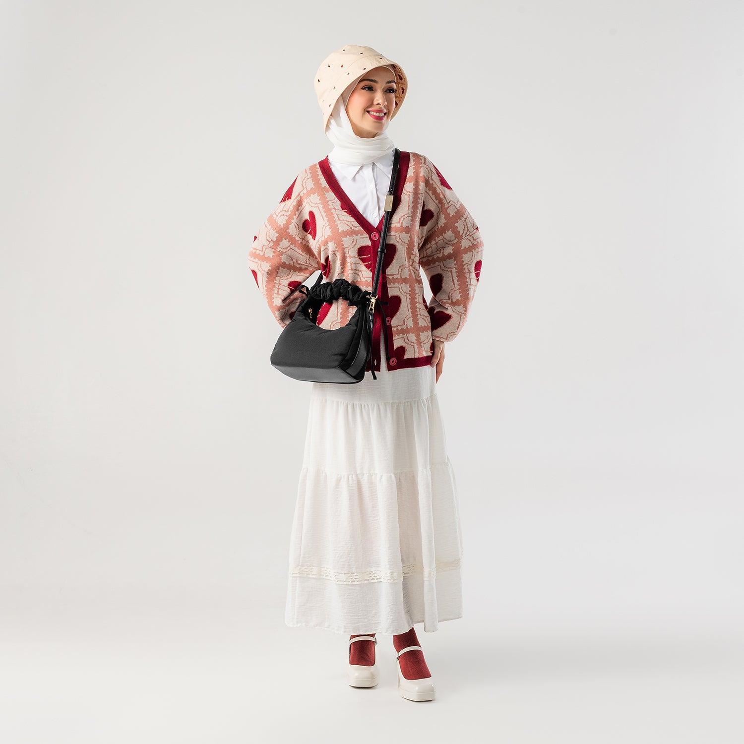 Carry it three ways: grab it by the scrunchie handle, sling it over your shoulder, or wear it crossbody with the long strap. The padded matte nylon body is water- and stain-resistant, ready to handle unexpected spills.