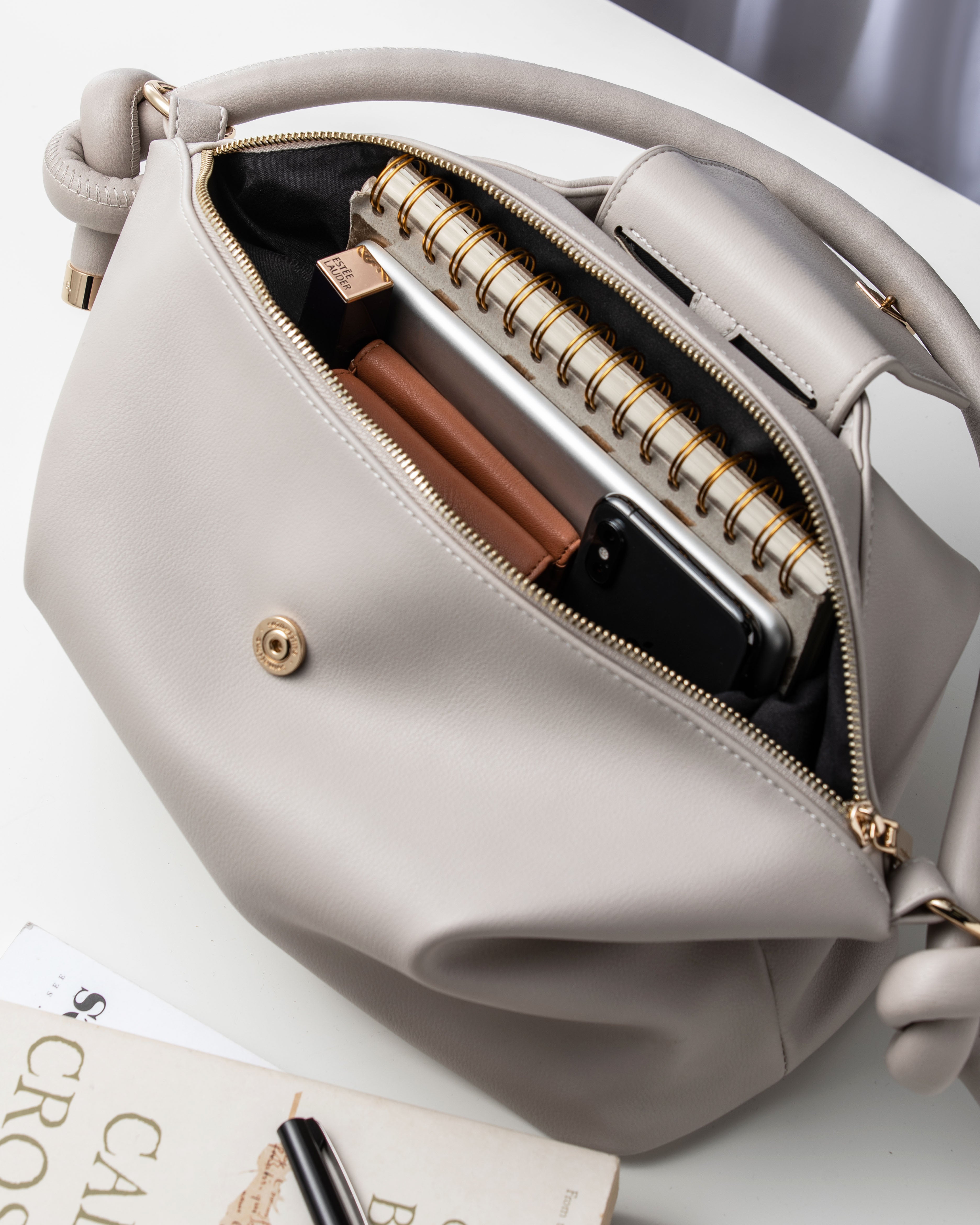 The Basta 3 accentuates a soft silhouette and boasts a spacious compartment. Its signature flap design is removable and can be worn as a phone bag on its own.