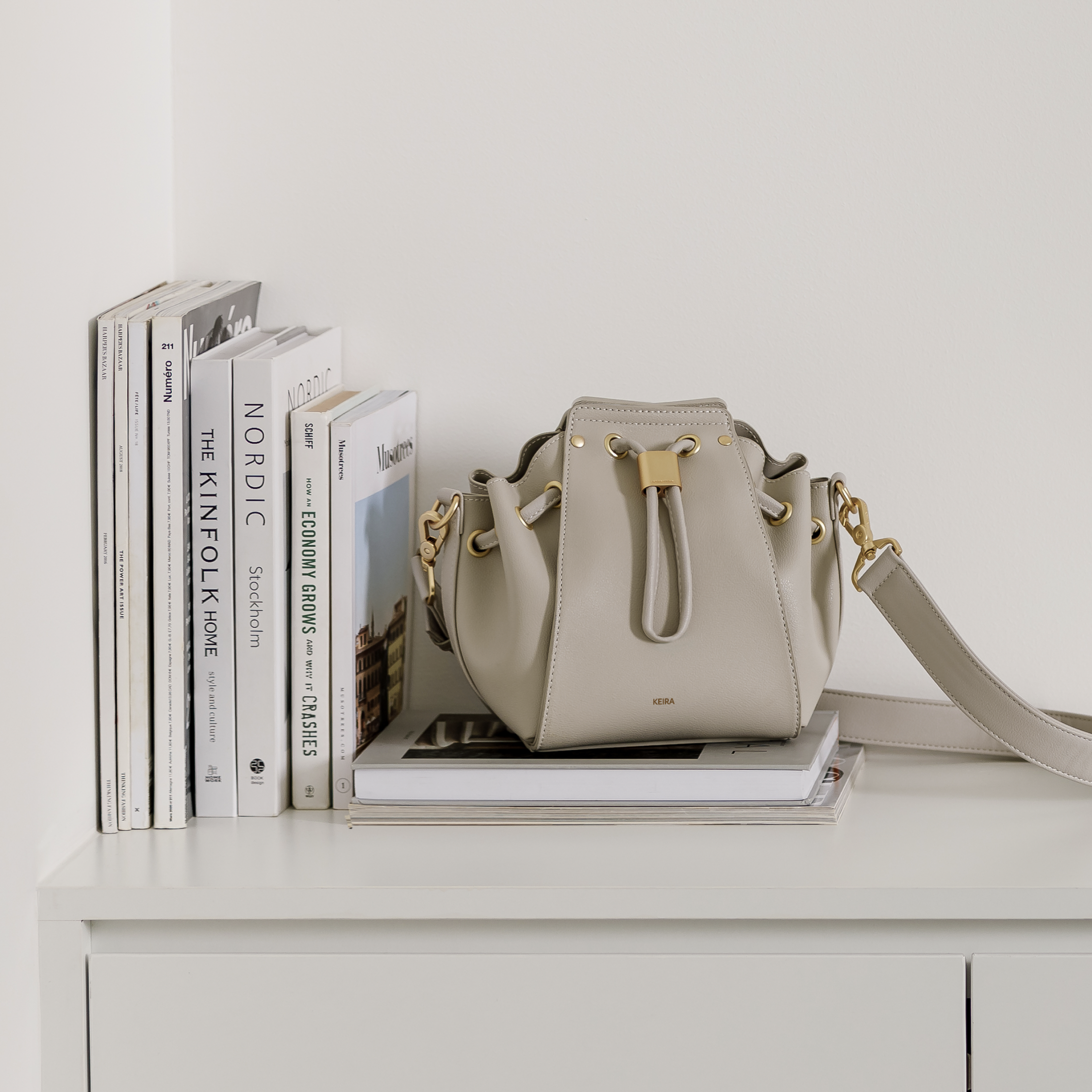 This is the Esbucket Mini, a petite bucket bag from the #IconicEssentials collection with easy magnetic button closure.